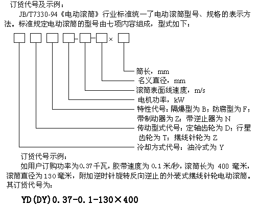 (2).用戶訂購逆止電動滾筒時,須注明旋轉方向,如不注明則為任意方向。其表示方法為在特性代號后加“S”(表示在電機引出線一側觀察,端蓋應順時針旋轉)或“N”(表示在電機引出線一側觀察,端蓋應逆時針旋轉)。