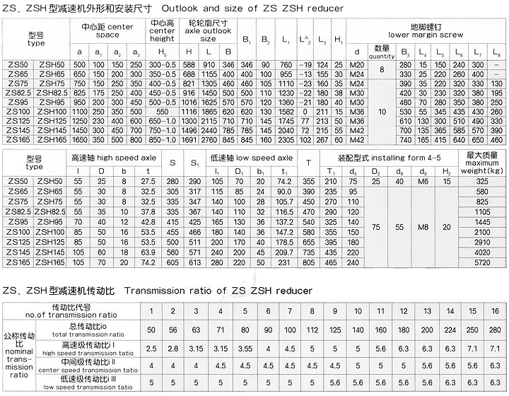| 型 號 | 高速軸 | S | 低速軸 | T | 裝配形式 | 最大質量kg | |||||||||||